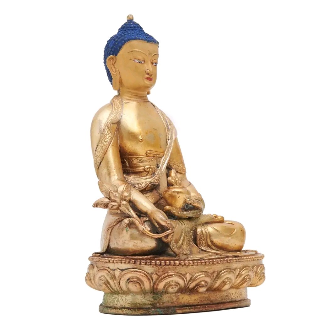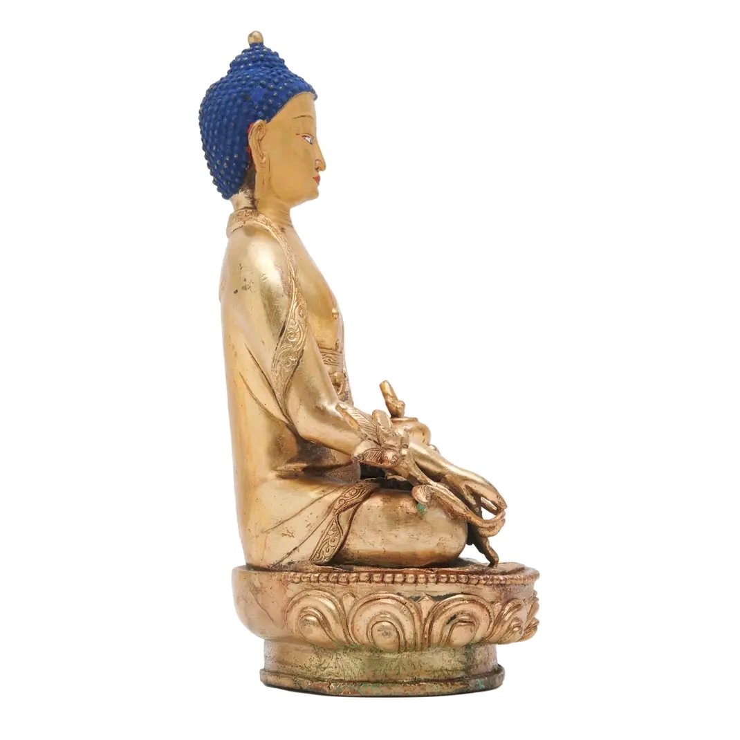 The Buddha is depicted seated in the full lotus position (padmasana) on an ornate, multi-tiered lotus throne. His right hand is in the Bhumisparsha mudra (“earth-touching” gesture), symbolizing the moment of his enlightenment when he called upon the earth goddess to witness his awakening. His left hand rests in his lap in the dhyana mudra of meditation.The face has a serene, meditative expression, with downcast eyes and a subtle smile. The hair is rendered in tight curls, surmounted by a small, pointed ushnisha (cranial protuberance), a sign of his enlightenment. The robe is draped simply over the left shoulder, leaving the right shoulder bare. The statue has a beautiful, rich dark patina, indicative of its age.