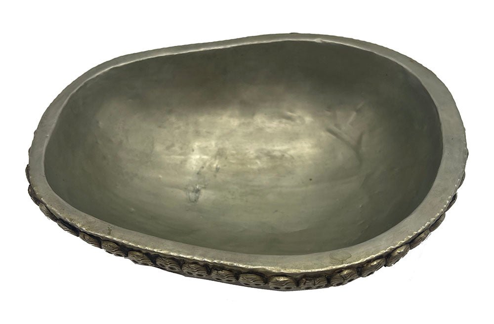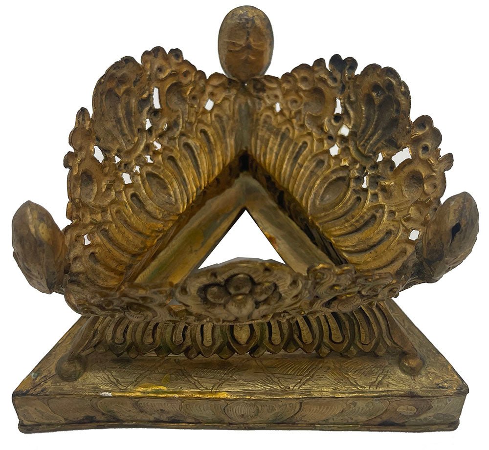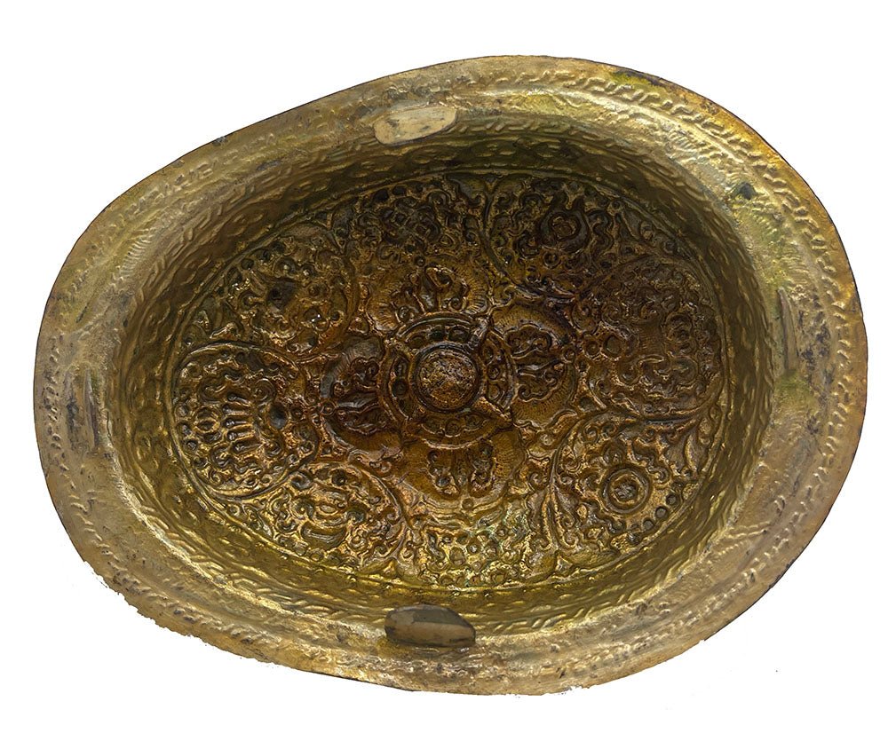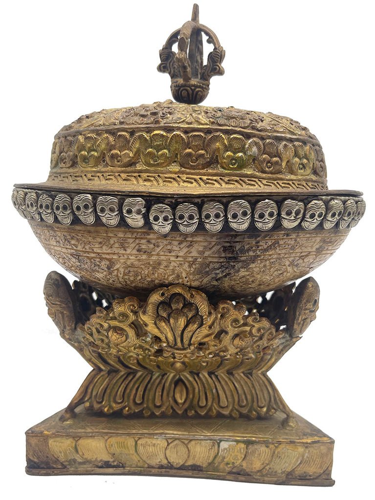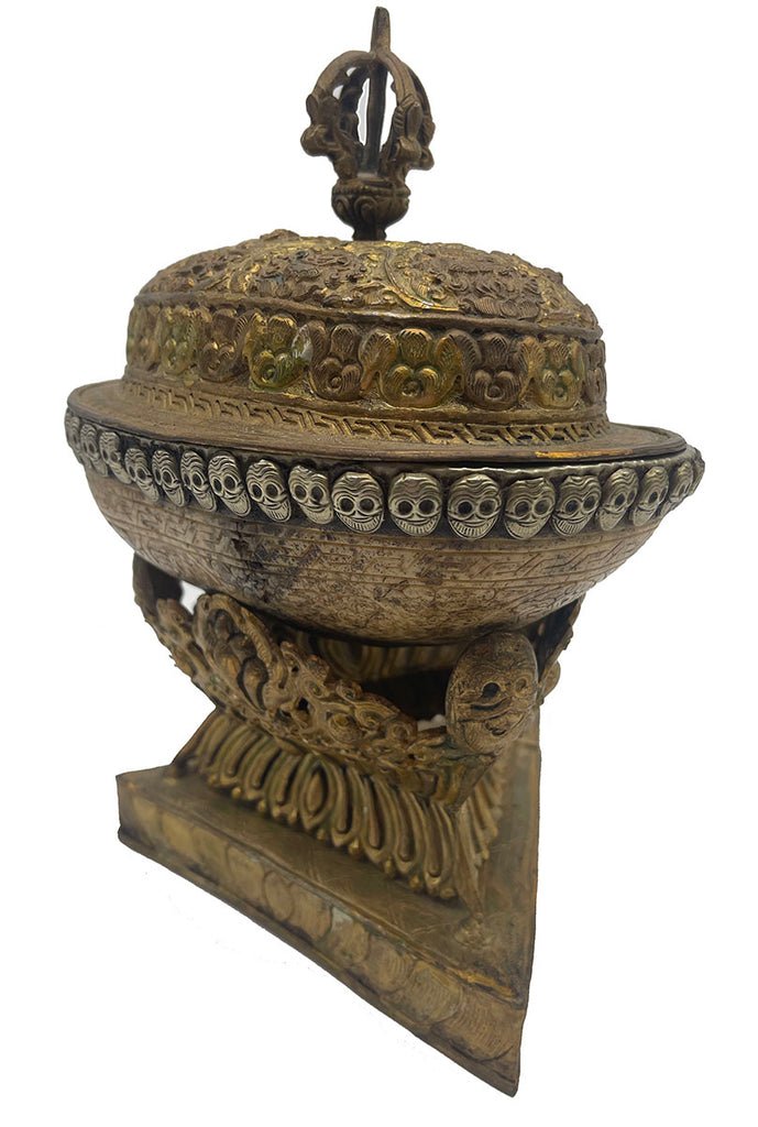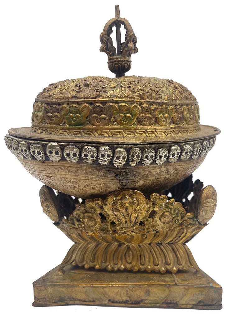 Central Asia, Tibet, ca. 19th century CE. A beautiful copper-lined example of a kapala, made from the top of a human skull ringed with flowing fringe panels in repousse. The interior of the skull is lined with a thin copper sheet that has been incised with four Tibetan characters around the basin walls and an intricate central flower in the center, and a form-fitting lid displays intricate floral patterns and prayer implements beneath a half-vajra handle. A decorative triangular copper base boasts projecting flaming walls, a trio of deity heads in the corners, and inlaid turquoise stones along the midsection. Fine patina envelops each component of this lovely example of macabre ritual drinkware! Size (w/ lid): 6.9″ L x 5.25″ W x 7″ H (17.5 cm x 13.3 cm x 17.8 cm); 9.4″ H (23.9 cm) on included copper stand.