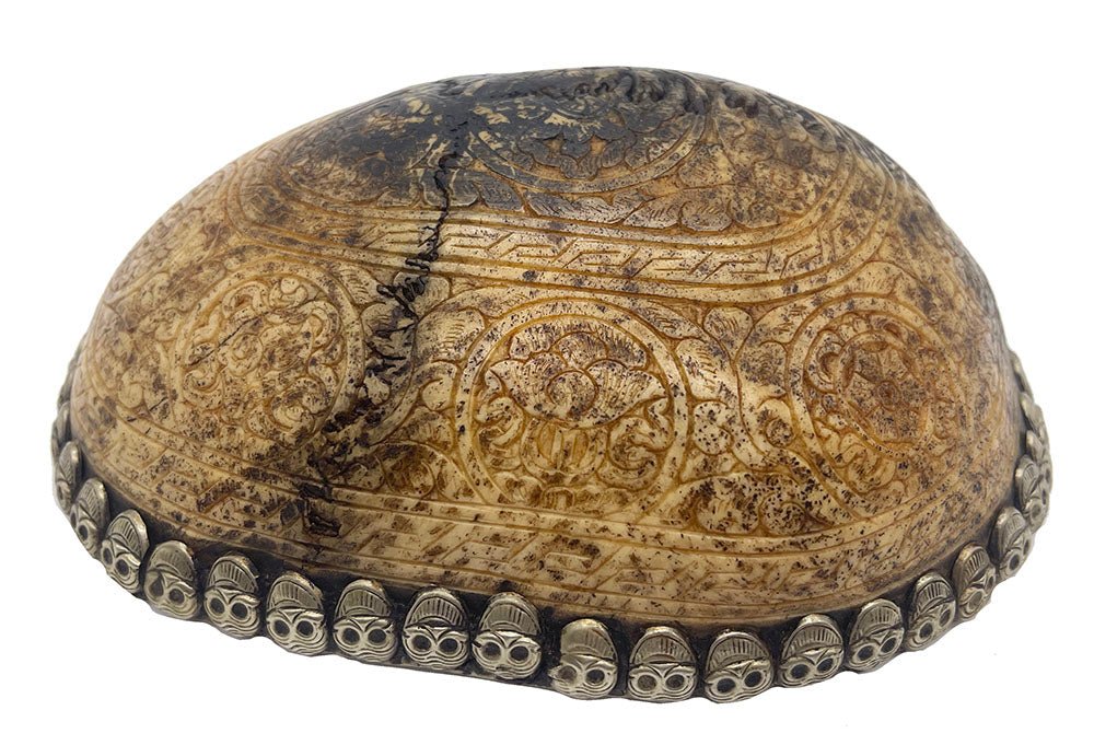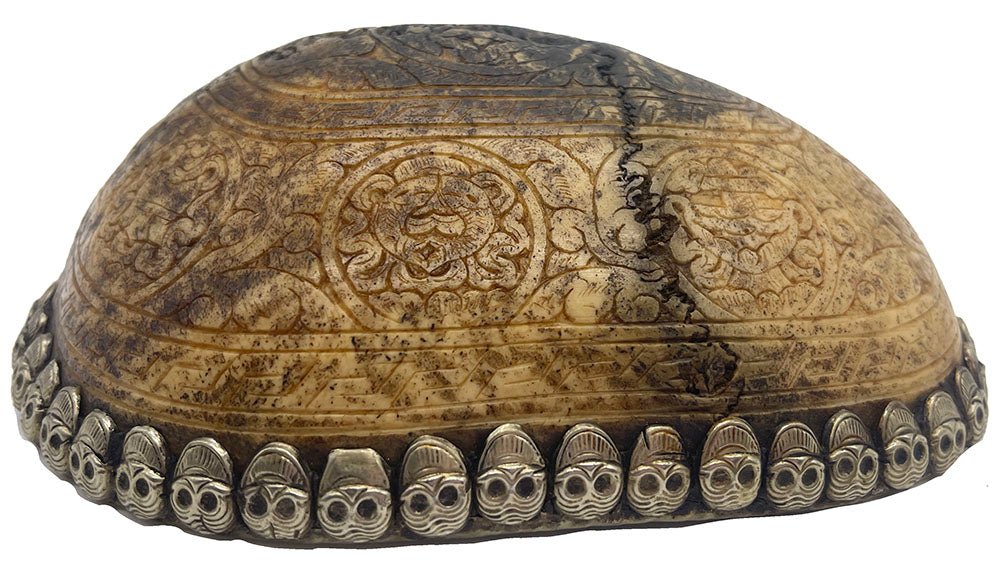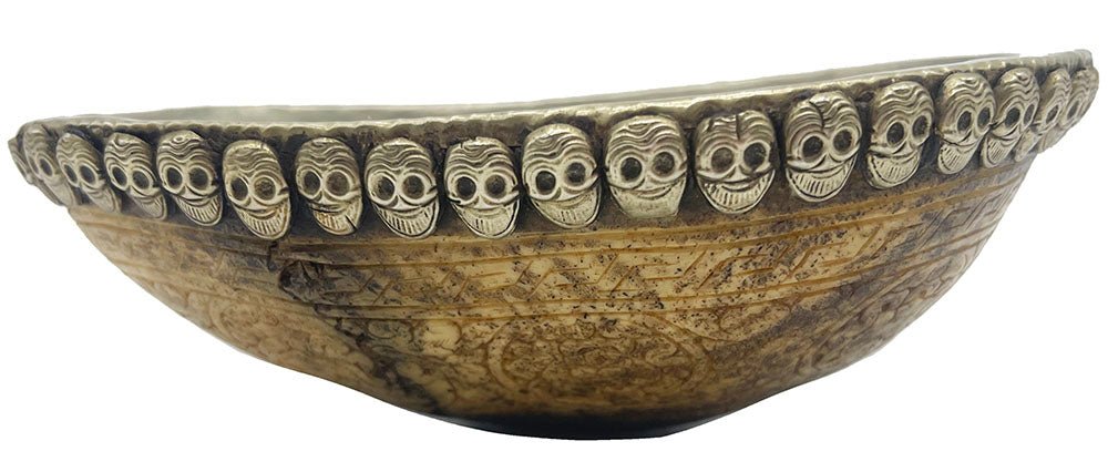 These beautiful objects are often made from skulls stripped of their flesh in sky burials, the compassionate Buddhist offering of the dead human form to local birds and other animals. Kapala and other ceremonial objects made from bone are part of the Tantric practice of reflection upon decay and the corruption of the corporeal form, as well as the desire to destroy the duality of attractiveness versus repulsion. Monks and yogis in this religion often meditate in graveyards or near the mountaintop sites of sky burials, surrounded by the unavoidable physicality of death. Although kapala may look to outside viewers like a disturbing fixation upon the grave – with much of Vajrayana Buddhism iconography focused on blood, corpses, and bones – they are actually a deliberate attempt to destroy the karmic hindrances that might bind a soul to this earthly life and prevent it from achieving enlightenment.