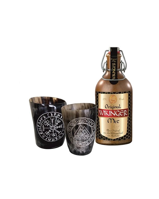 The set is complemented by two handcrafted horn cups with detailed Viking engraving, perfect for authentic drinking moments.