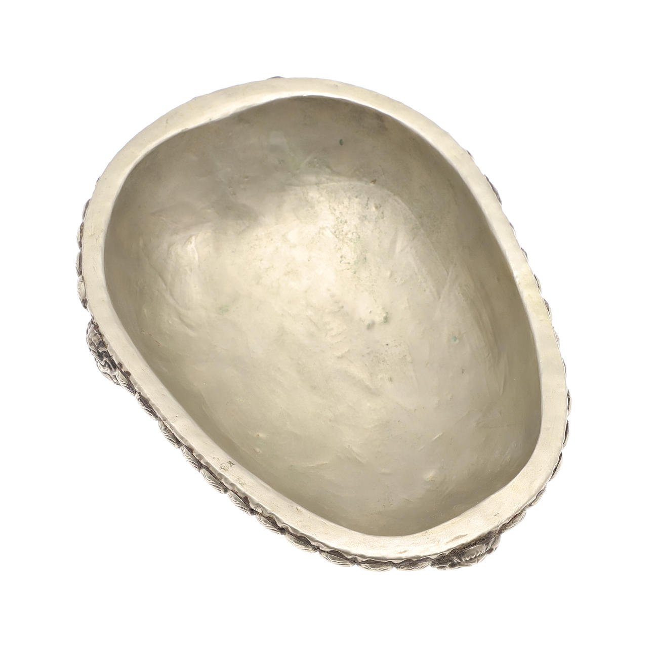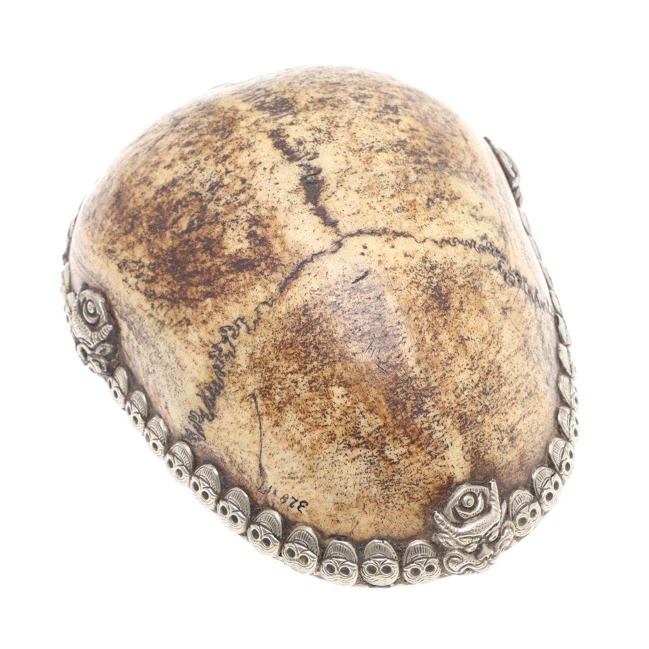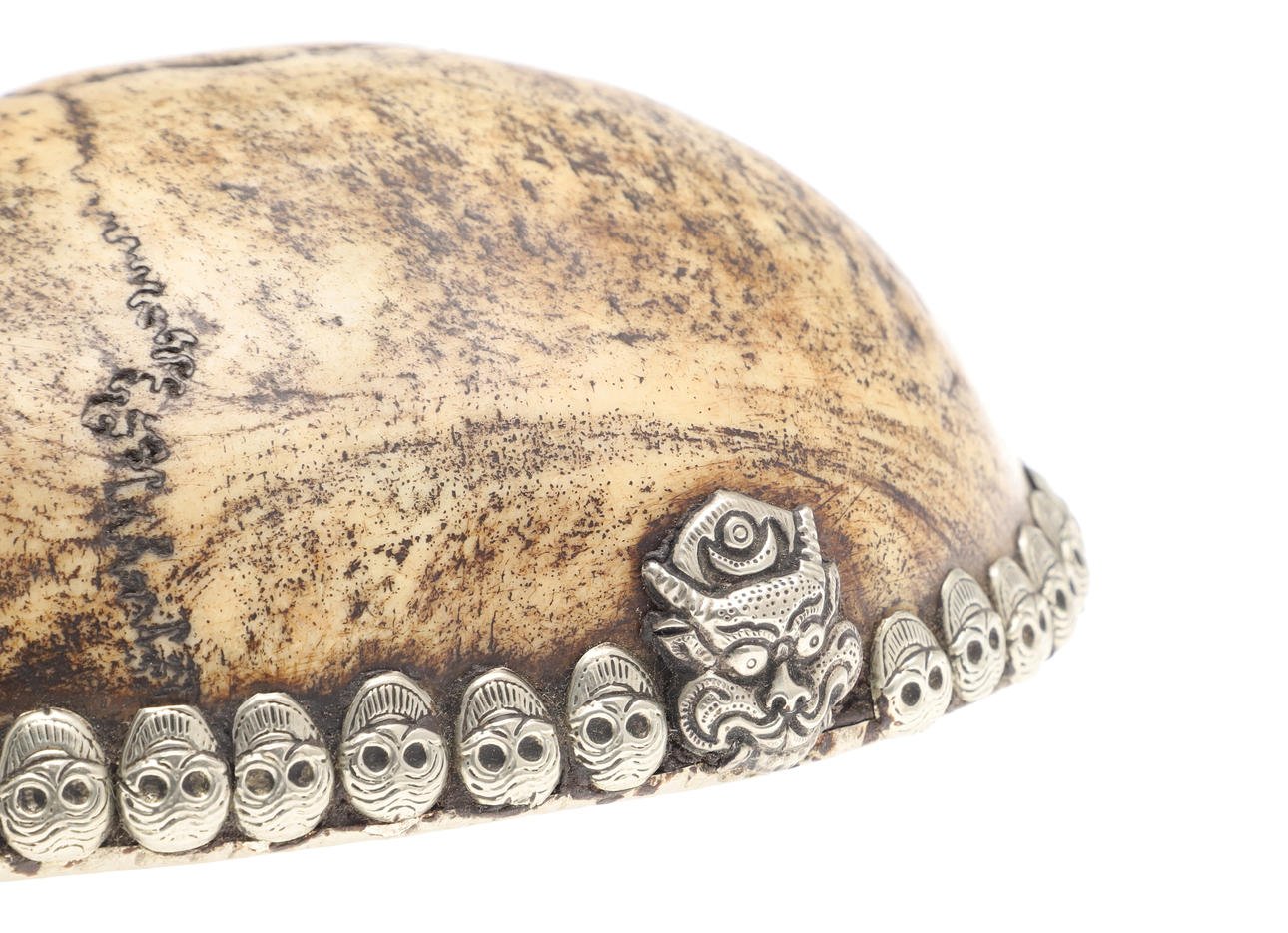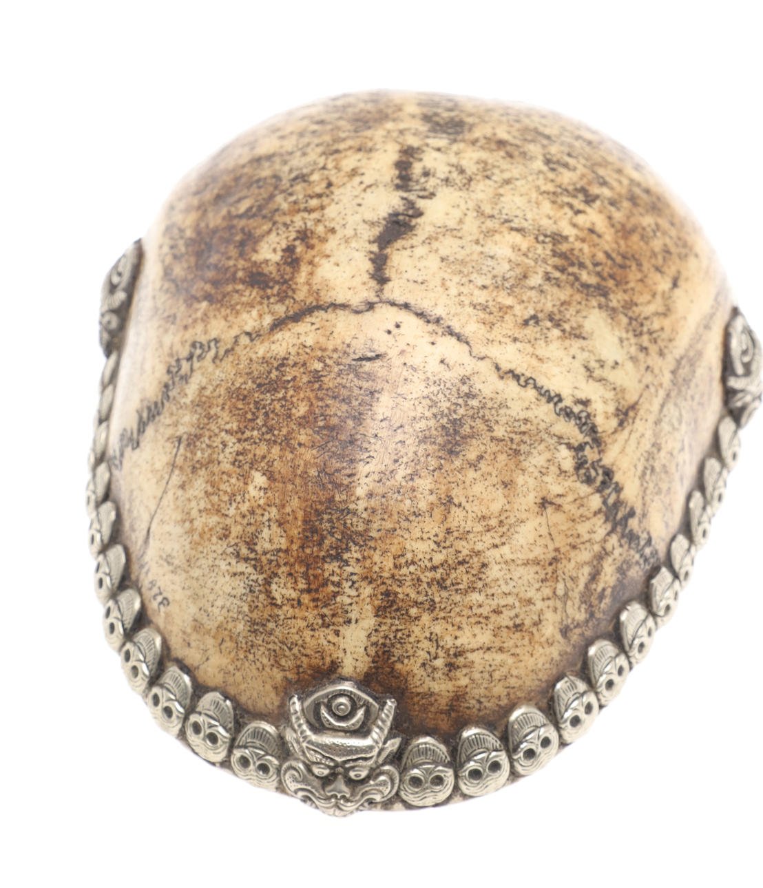 “The word kapala is a Sanskrit term meaning skull, bowl, vessel, begging bowl and a decorative human skull used as a ritual implement in both Hindu and Buddhist Tantra. The practice and conception of Tantra came into being in the 5th 6th century in India and then spread across southeast Asia. The skull bowls were often carved with decorative designs or elaborately mounted with precious metals or jewels. There are two main forms those that use a full skull and those that use only the cranium. In Tibetan monasteries the kapala was used to hold dough cakes or wine, used symbolically as flesh and blood offerings to deities of fearsome Hindu and Tibetan tradition. When symbolising blood it is called ‘Asrk kapala’ and when flesh it is called ‘Mamsa kapala’. This kapala is the cranium form, lined with silver and decorated on the rim with small silver skulls and with four images possibly Yama the lord of death in verdict mythology”.