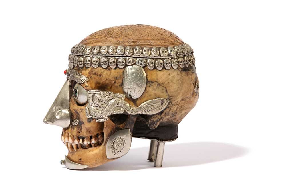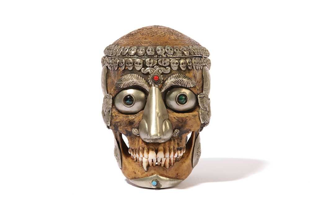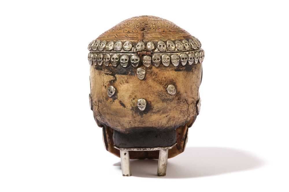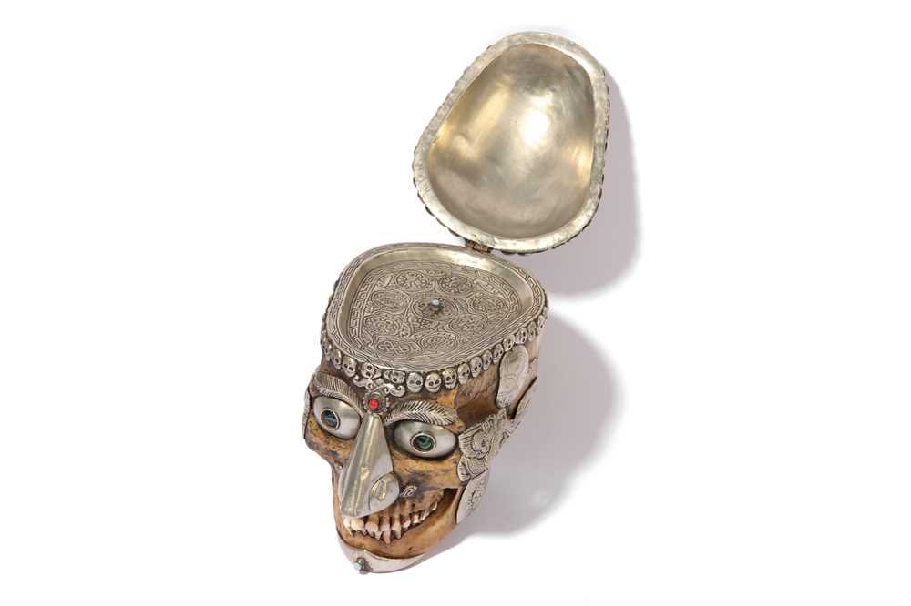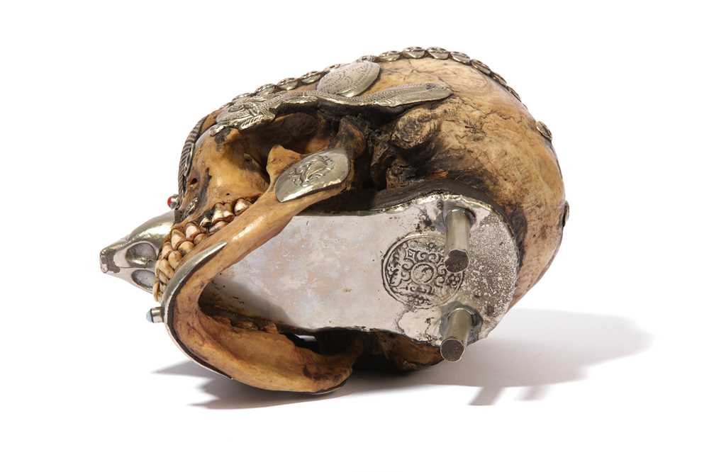 the skull cap carved with symbol roundels, the rim of the skull cap and skull mounted with a repeating border of skull masks, the lined skull cap hinged to reveal a flat top chased with the same symbol roundel design as the skull cap, the jaw, eyes and cheeks mounted, the top set with turquoise, the forehead mounted with a red hard stone and the eyes mounted with glass, the white metal unmarked / untested, 17.5cm high x 19.5cm long