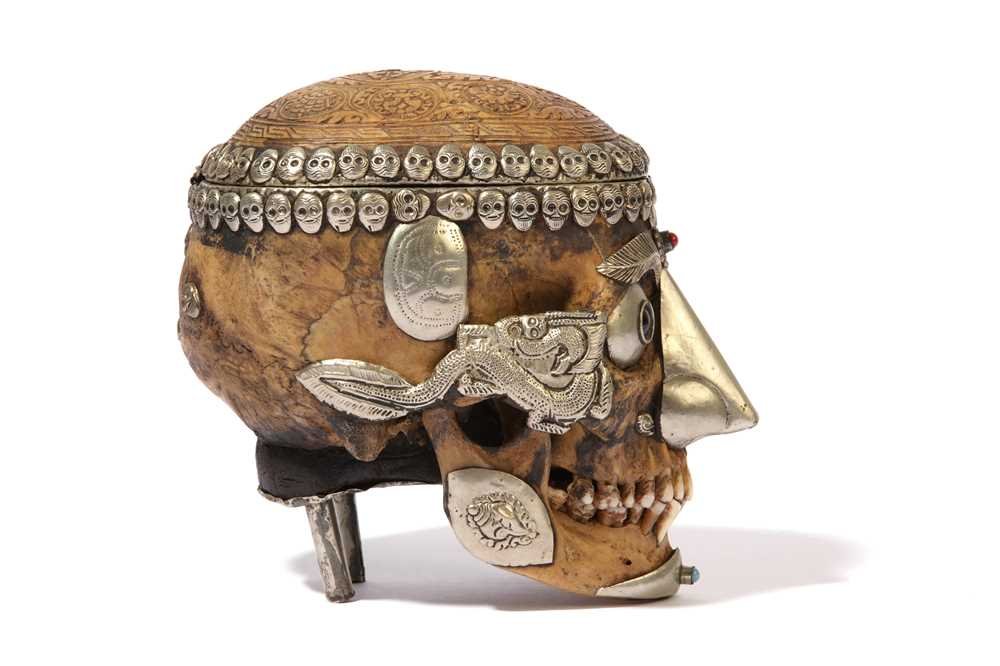 A Kapala, Sanskrit for ‘skull’, is a cup made from a human skull used as a ritual implement in both Hindu Tantra and Buddhist Tantra (Vajrayana). Many of the deities of Vajrayana, including Mahasiddhas, Dakinis and Dharmapalas are depicted carrying a Kapala, usually in their left hand. In Tibetan monasteries it is used symbolically to hold bread or dough cakes, torma, and wine instead of blood and flesh as offerings to these wrathful deities. The dough cakes are shaped to resemble human eyes, ears and tongues. A kapala is made in the form of a skull specially collected and prepared for its spiritual properties from either a Charnel ground (interpreted as the sky burial by Western society) or they are the skulls of donors, usually persons of special rank, wisdom or holiness. Only after meeting the approval of the lamas can a skull be made into an offering vessel for presentation to the divine beings. They are then elaborately anointed and consecrated before use in a monastery.